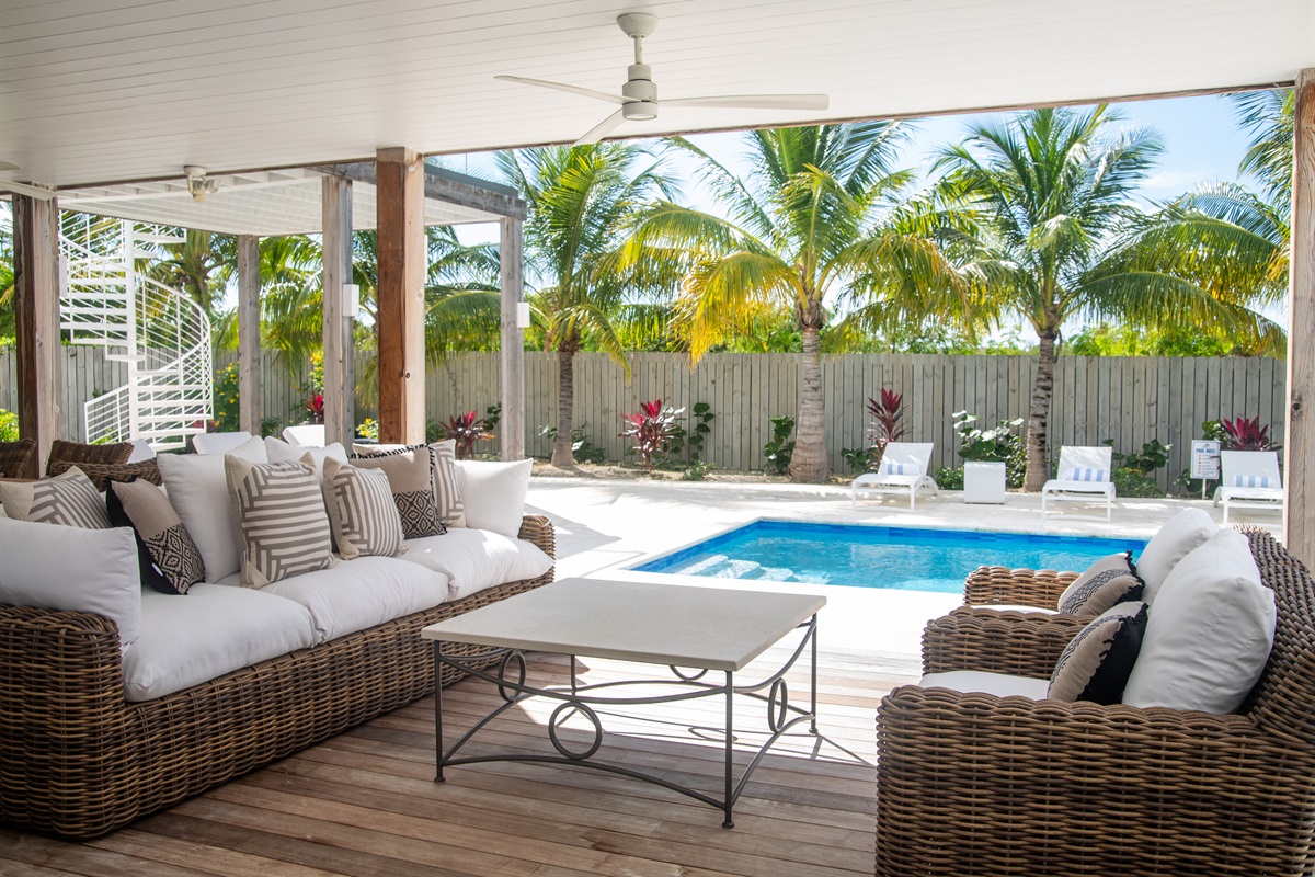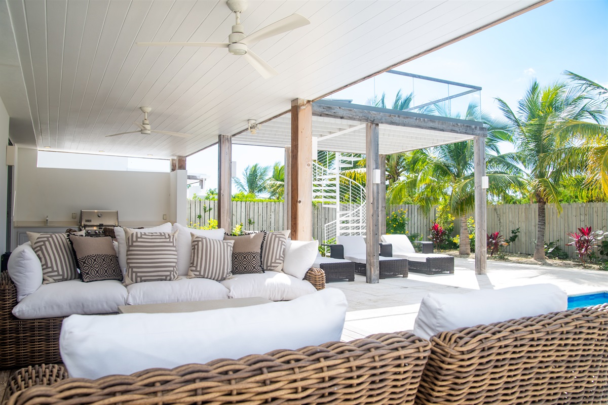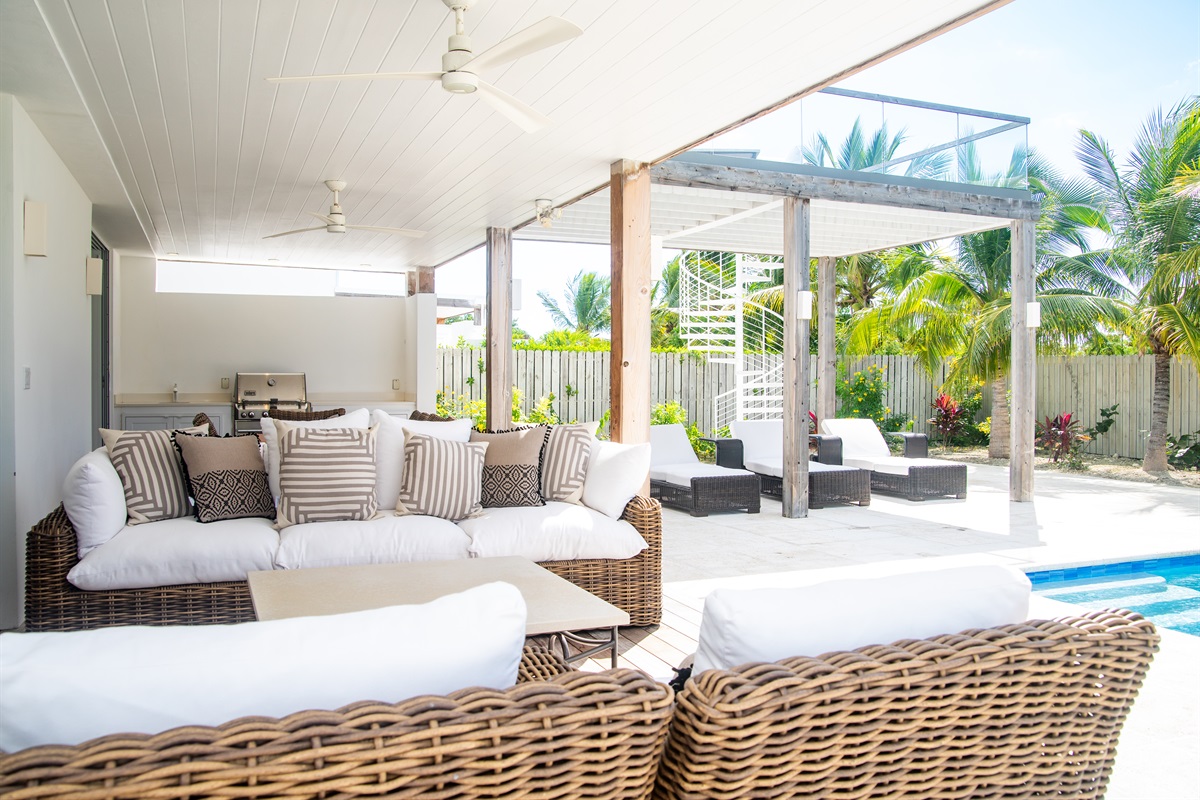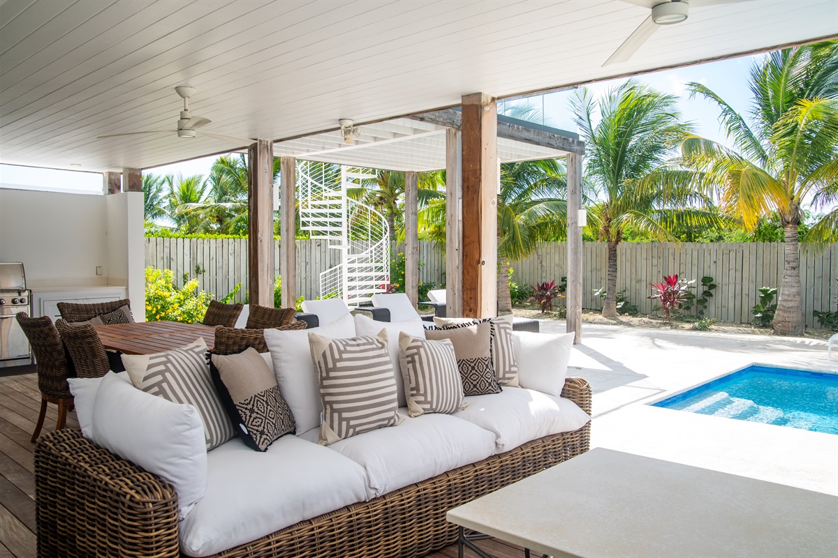 - Outdoor plush living area and elegant dining under roof with ceiling fans