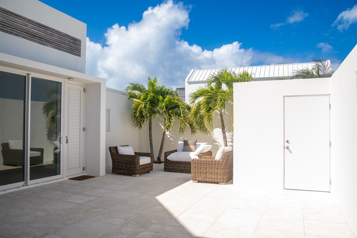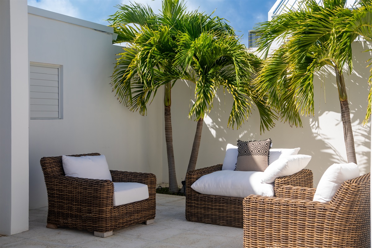 - Gated, secure entry courtyard with tropical landscaping and seating arrangement.